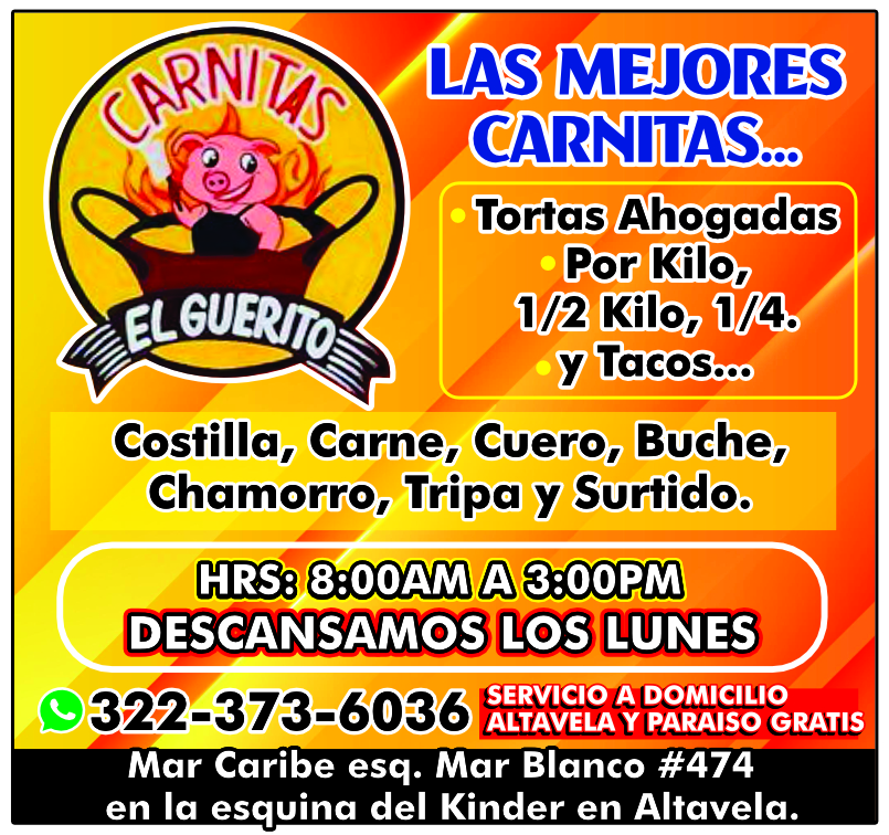 Carnitas El Guerito las mejores carnitas carnitas por kilo, 1/2 kilo, 1/4 kilo tortas ahogadas, tacos. costilla, carne, cuero, buche,...